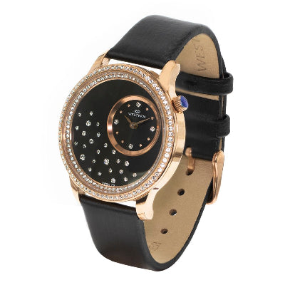 Elegant Women’s Watch – Stainless Steel, Black Leather & Crystal Accents